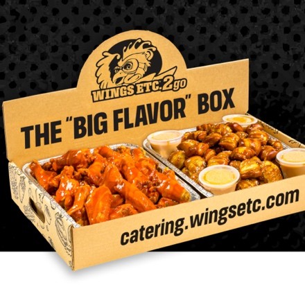 Wings Etc. catering features a variety of fan-favorite menu options, including its award-winning jumbo and boneless wings, paired with more than 20 sauces and rubs, along with sides, appetizers, wraps and salads designed to feed groups of all sizes — conveniently packaged in the brand’s popular Big Flavor Boxes.